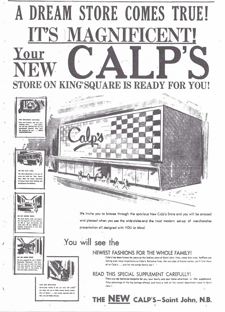 The store was destroyed by fire in 1943, but was rebuilt soon after. When Calp’s closed in 1993, it was one of the largest independent department stores in the Maritime Provinces.