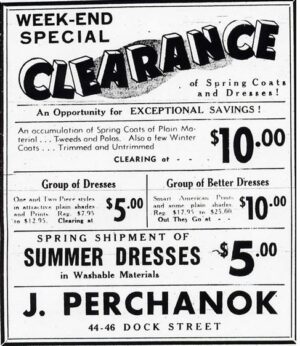 “I left high school and then I went to Vocational School for a half a year and then I worked at Perchanok’s. Perchanok’s had the dress shop. …they were still on Dock Street … and I used to come after school and deliver the parcels, the dresses and so forth. I worked at that and then in 1929 I went to work at Vassie, Brock, Manchester on King Street, the wholesalers. My father got me a job there, the only Jew, the one and only Jew that ever worked there, and I started out in 1929 at four dollars a week which was a big salary in those days. …”