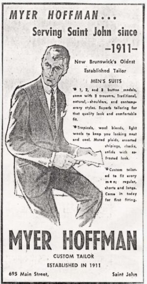 “I went to public school in Saint John. I went to Dufferin School, that’s where I think most of the Jewish children in the North End went to public school up to grade six, I believe. And then … then we transferred over to King George School out in Douglas Avenue for grade seven and eight. And after grade eight I went to Saint John High School. We were the first grade nine class to enter Saint John High School, the new Saint John High School, and it was then on Prince William Street. We were the first class of grade nine. We graduated from high school, and that was about ‘36, I believe 1936, and I went to work for a late uncle of mine, Barney Jacobson, who had a family clothing store on Main Street. And that was for the princely sum of five dollars a week which was lots of money in those [days]. … “